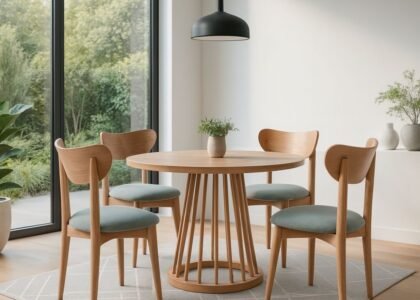 Sofa lineal color grisMesa moderna color natural, seike, estilo escandinavoMesa moderna color natural, seike, estilo escandinavoJuego de comedor para cuatro personas. Mesa y cuatro sillas fabricados en madera sólida de seike, color madera naturalSillón redondo color mostaza con base metal, moderno